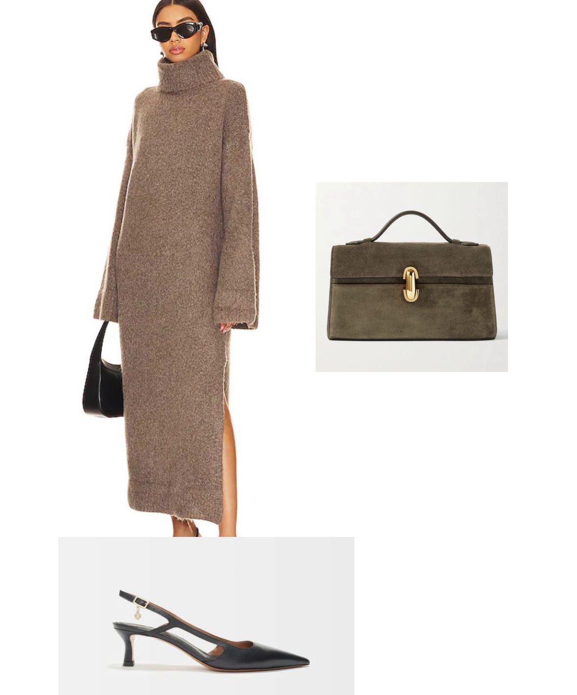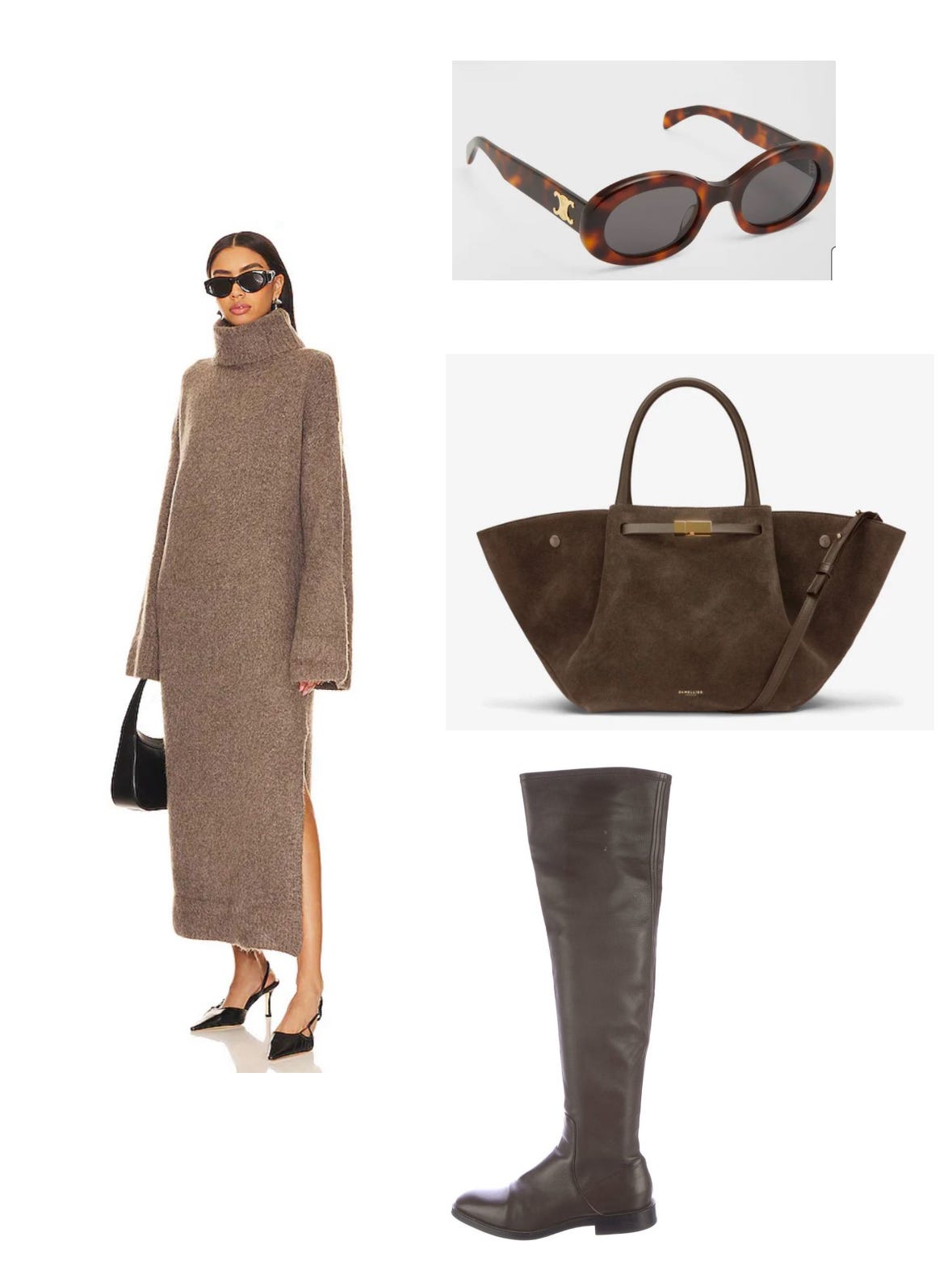Revolve dress, Demellier bag, Brunello Cucinelli boots, Celine sunglasses
