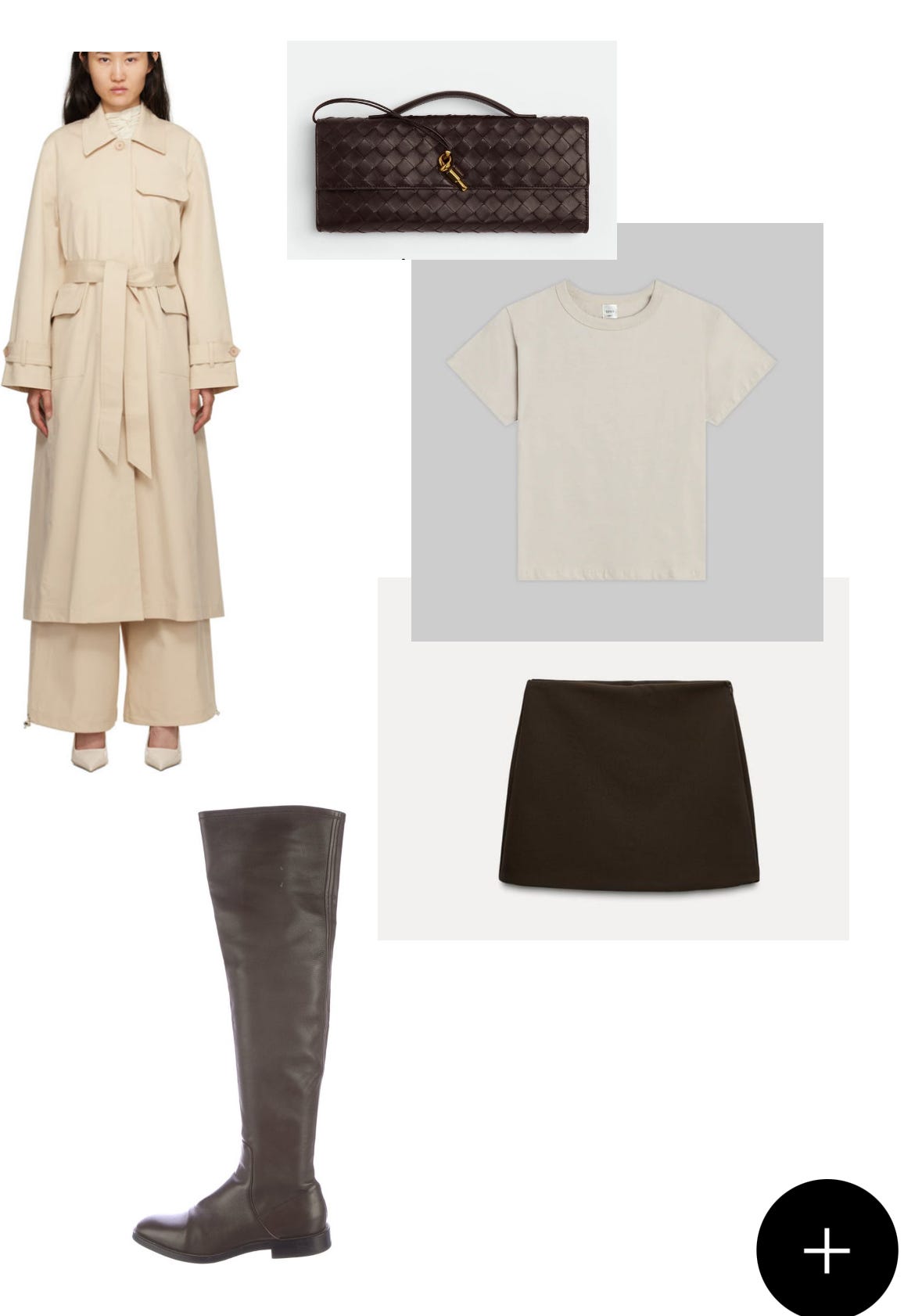 Beaufille coat, Bottega Veneta bag, Le Set tee shirt, Zara skirt, Brunello Cucinelli boots