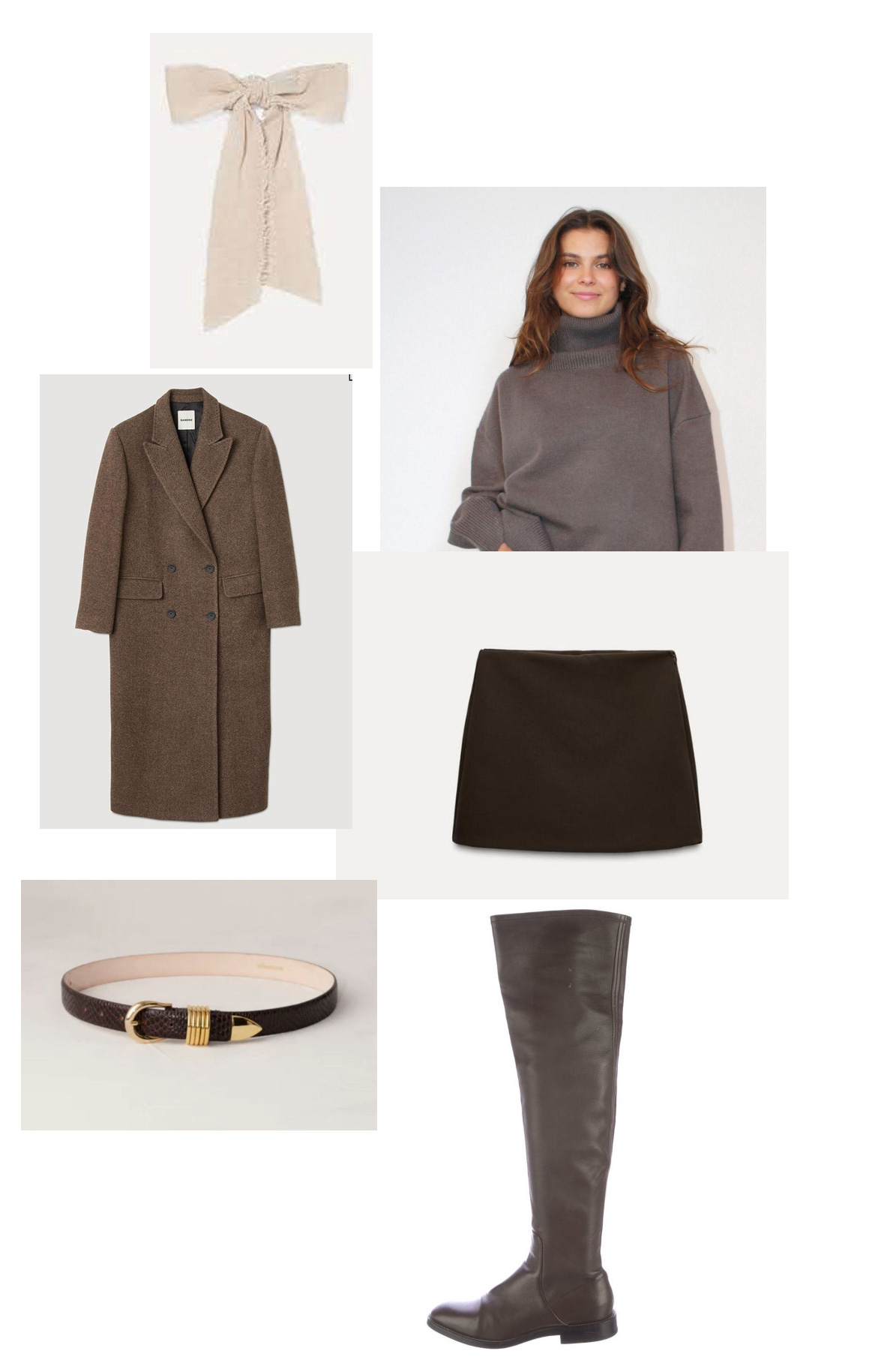 Lelet bow, Sandro coat (similar), Boii sweater, Zara skirt, Brunello Cucinelli boots, Dehanche belt
