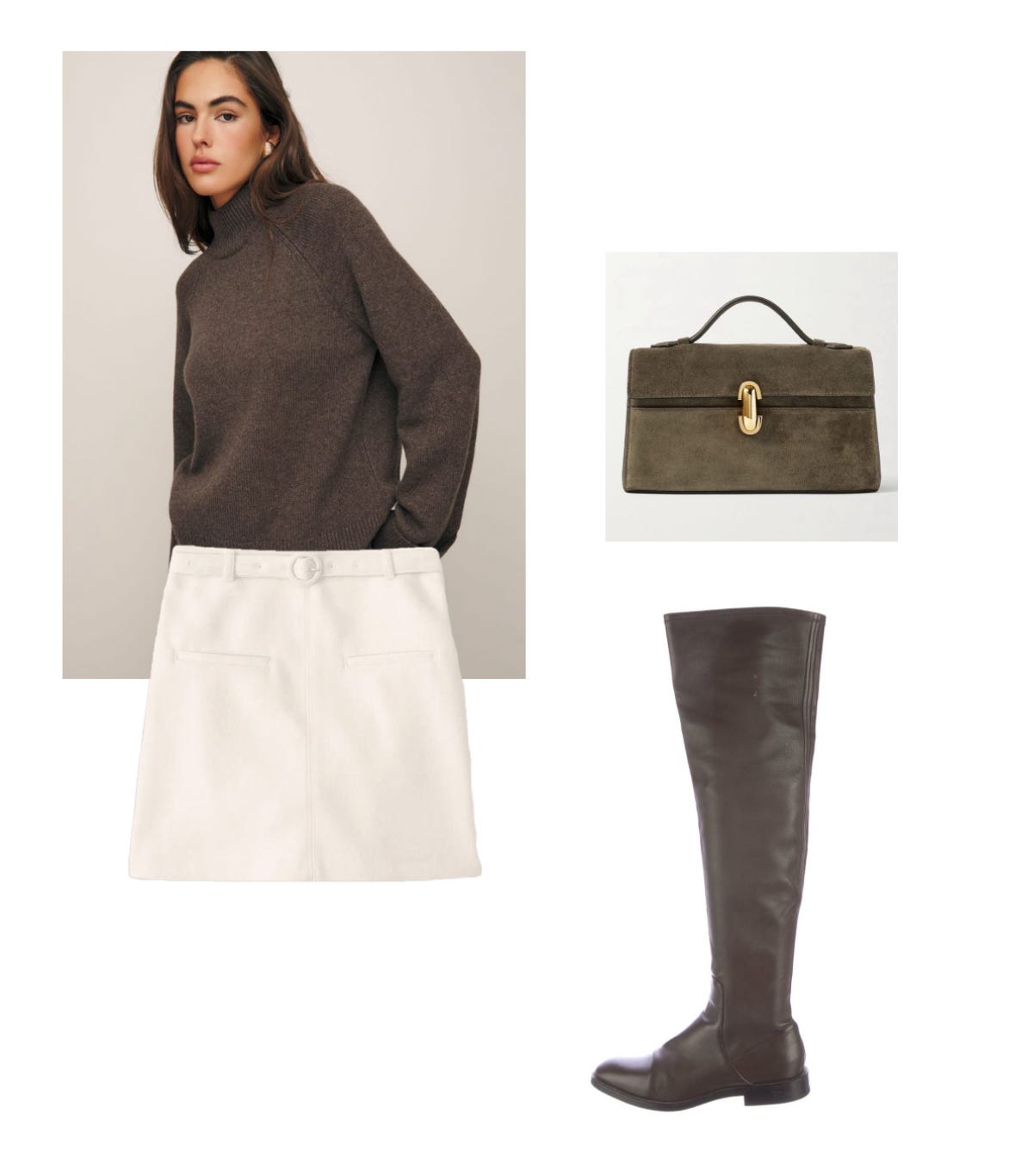 Reformation sweater (similar), Abercrombie skirt, Savette bag, Brunello Cucinelli boots
